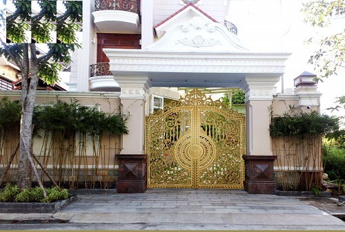 Cổng nhôm đúc mạ đồng hoa lá tây được khá nhiều khách khách hàng sử dụng vì sự đơn giản, hài hòa và dễ “ăn nhập” với hầu hết các kiểu kiến trúc.